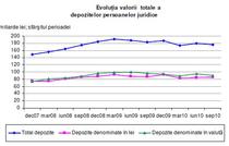 La data de 30 septembrie 2010 persoanele juridice detineau la institutiile de credit din România depozite în suma de 176,4 miliarde lei. Mai mica atat fata de vara lui 2010 cat si fata de toamna anului trecut.