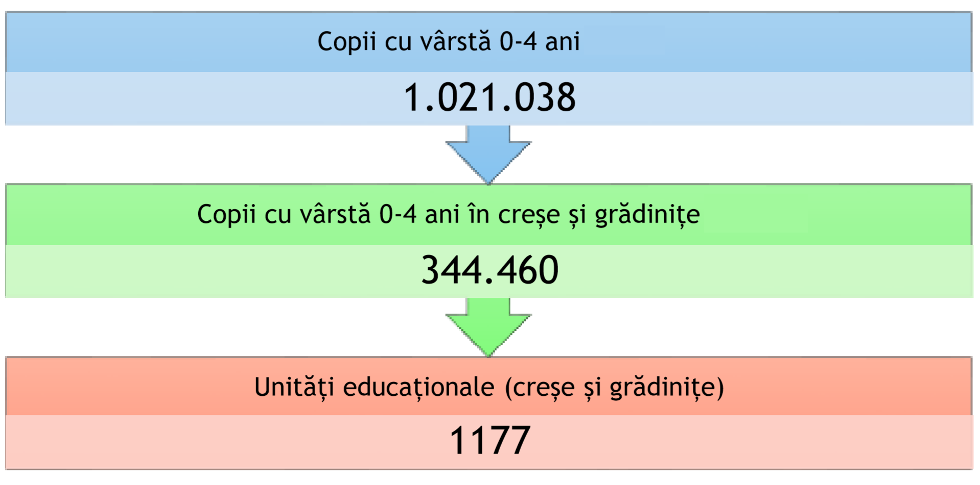 De aceea, este foarte important să avem în vedere următorul indicator: copii în creşe sau grădiniţe, în vârstă de 0-4 ani. Acest indicator completat de datele la nivel de populaţie pe grupe de vârstă, în acest caz populaţia în vârstă de 0-4 ani, ajută autorităţile să identifice mai uşor numărul de unităţi educaţionale necesare.