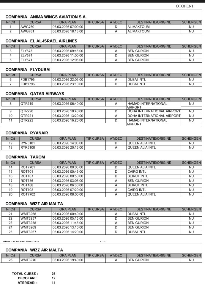 Cursele anulate aparţin companiilor Anima Wings, El Al, Fly Dubai, Qatar Airways, Ryanair, Tarom, Wizz Air. Deşi prezentate iniţial ca anulate, de fapt, zborurile Sky Up cu destinația Sharm El Sheikh nu operează, însă destinaţia este deschisă, au anunțat reprezentanții Companiei Naționale Aeroporturi București.