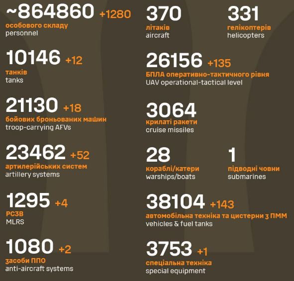 Estimarea ucraineană a pierderilor rusești de ieri: 1280 soldați, 12 tancuri, 18 alte blindate, 52 tunuri, 4 lansatoare multiple de rachete, 2 sisteme antiaeriene, 143 diferite vehicule și 1 echipament special.