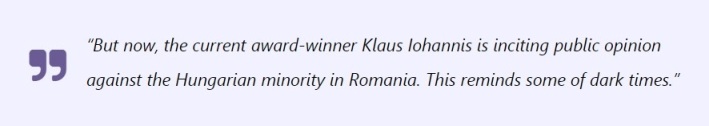Autorul textului de opinie menționează că „Iohannis aparține minorității sașilor transilvăneni din România, care au fost suspectați colectiv de fascism după al doilea război mondial și, ca toate minoritățile din țară, au suferit experiențe dureroase în timpul dictaturii de un naționalism grotesc a lui Ceaușescu. Dar acum Iohannis însuși practică un joc politic cu unul din cele mai rele clișee ale naționaliștilor români – mitul că Ungaria se străduie să separe Transilvania și folosește minoritatea maghiară din țară ca o coloană a cincea”.