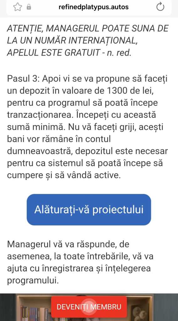 „Dacă citiți așa-zisul interviu veți ajunge la un moment în care vi se va explica faptul că dacă vreți să vă alăturați proiectului trebuie să vă completați datele personale și este posibil să fiți sunat de unul dintre managerii proiectului, care vă va cere să depuneți o sumă de 1.300 de lei. (…) Practic, oferiți toate datele de care au nevoie pentru a vă contacta și a vă furniza un cont pentru a vira suma pentru așa-zisa pensie uriașă, sumă care va intra în conturile lor”, a mai explicat reprezentantul MAI.