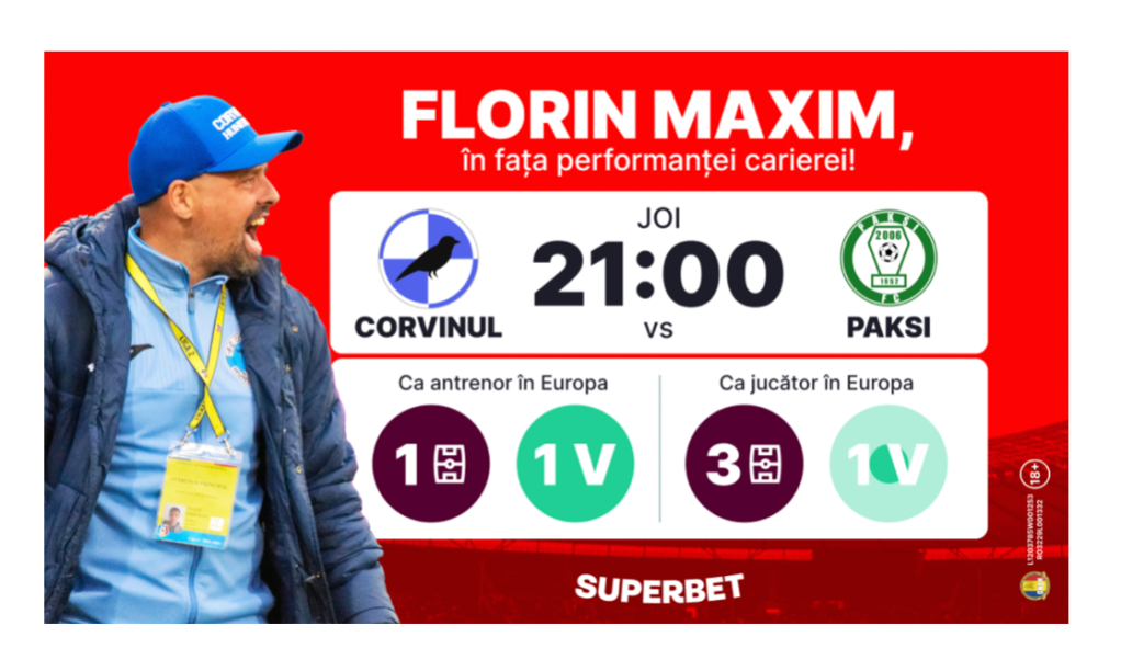 Cea mai surprinzătoare echipă a ultimului an în fotbalul românesc e gata de o nouă seară magică! De la ora 21:00, la Sibiu, Corvinul lui Florin Maxim întâlnește Paksi, vicecampioana Ungariei, în manșa a doua a primului tur al Europa League, într-o partidăă care începe de la 4-0 pentru gazde și care se anunță o adevărată sărbătoare. Cu calificarea asigurată în proporție de 99%, câștigătorii Cupei au o formalitate de îndeplinit, live pe Superbet alături de SuperPariuri, BetBuilder, Cote mărite și alte surprize!