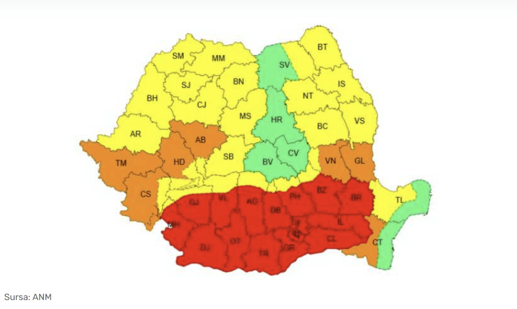 Alte șapte județe se află sub cod portocaliu de caniculă. „În Banat, sud-vestul Transilvaniei, sudul Moldovei și al Dobrogei continentale, valul de căldură se va menține, va fi caniculă, disconfort termic accentuat, iar indicele temperatură-umezeală va depăși pragul critic de 80 de unități. Temperaturile maxime se vor încadra între 36 și 39 de grade, iar minimele nu vor coborî sub 20 de grade, caracterizând o noapte tropicală”, anunță ANM.