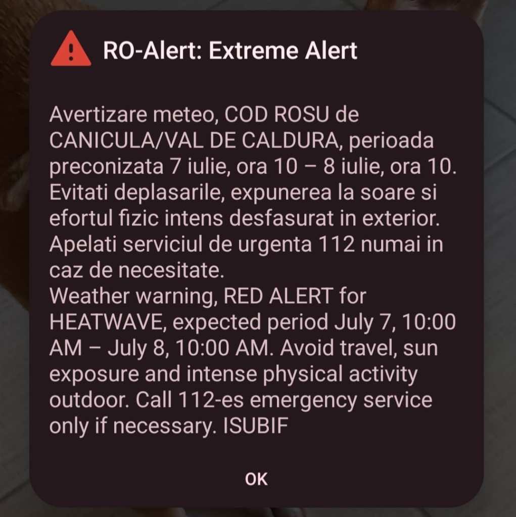 „Avertizare meteo, COD ROSU de CANICULA/VAL DE CALDURA, perioada preconizată 7 iulie, ora 10 – 8 iulie, ora 10. Evitați deplasările, expunerea la soare și efortul fizic intens desfășurat în exterior. Apelați serviciul de urgență 112 numai în caz de necesitate”, este mesajul transmis de autorități.