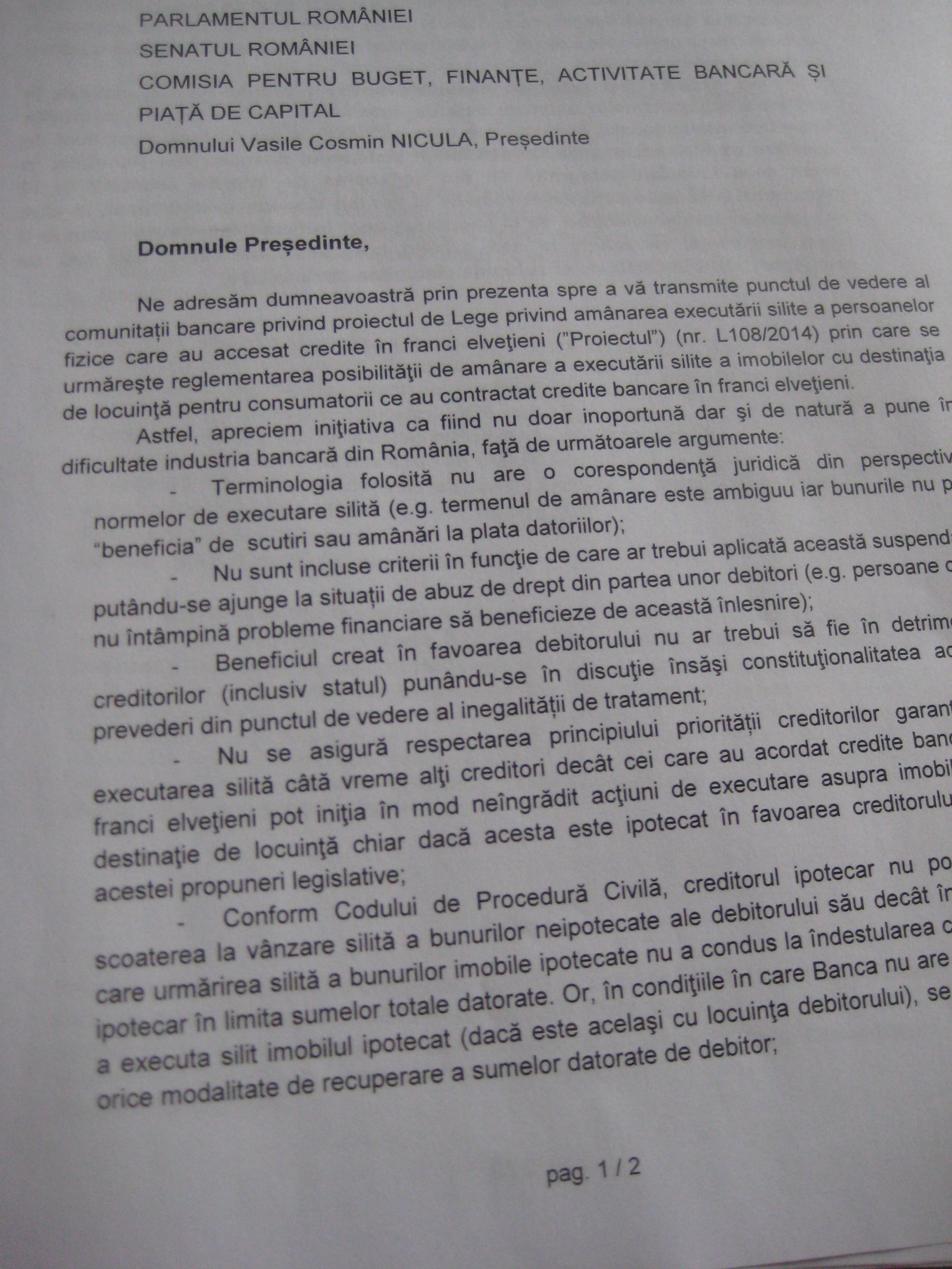 Ne adresam dumneavoastra prin prezenta spre a va transmite punctul de vedere al comunitatii bancare privind proiectul de Lege privind amanarea executarii silite a persoanelor fizice care au accesat credite in franci elvetieni („Proiectul”) (nr. L10812014) prin care se urrnareste reglementarea posibilitatii de amanare a executarii site a imobilelor cu destinatie de locuinta pentru consumatorii ce au contractat credite bancare in franci elvetieni. Astfel, apreciem initiativa ca find nu doar inoportuna dar de natura a pune dificultate industria bancara din Romania”, se arata in scrisoarea transmisa Comisiei.(vezi mai jos facsimil)