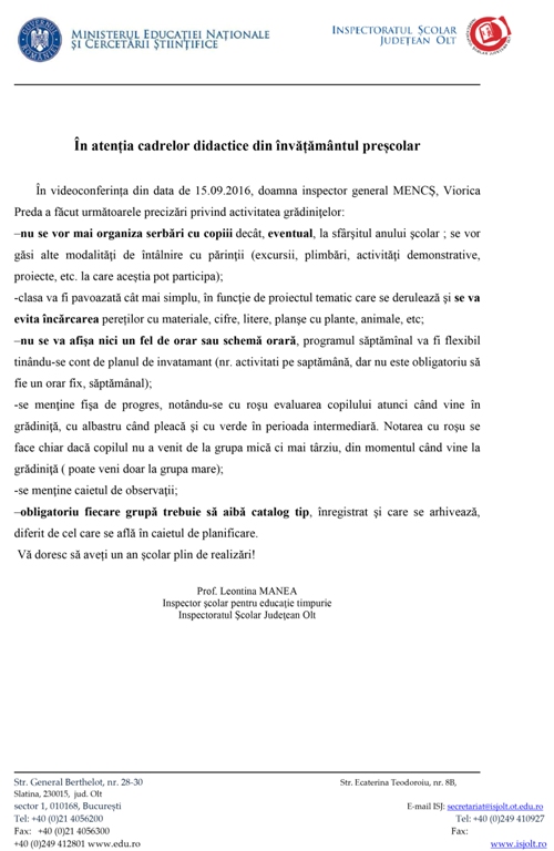 In videoconferinta din data de 15.09.2016, doamna inspector general MENCS, Viorica Preda a facut urmatoarele precizari privind activitatea gradinitelor: