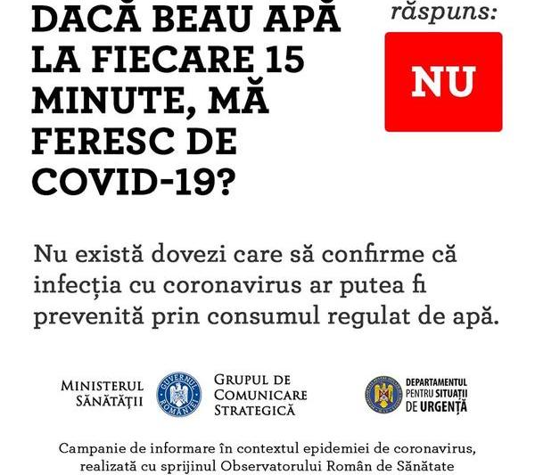 Ministerul Sănătății: Fake news – dacă bem apă la fiecare 15 minute coronavirusul ajunge în stomac, unde este neutralizat