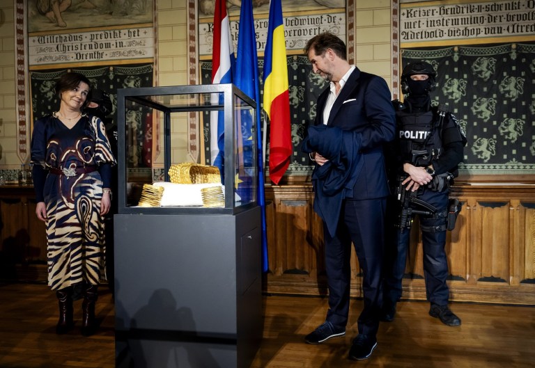 Coiful de aur de la Coțofenești a fost recuperat joi, la 14 luni de la jaf. O a treia brățară este încă dată dispărută, au anunțat autoritățile olandeze, într-o conferință de presă în care au prezentat și coiful găsit.