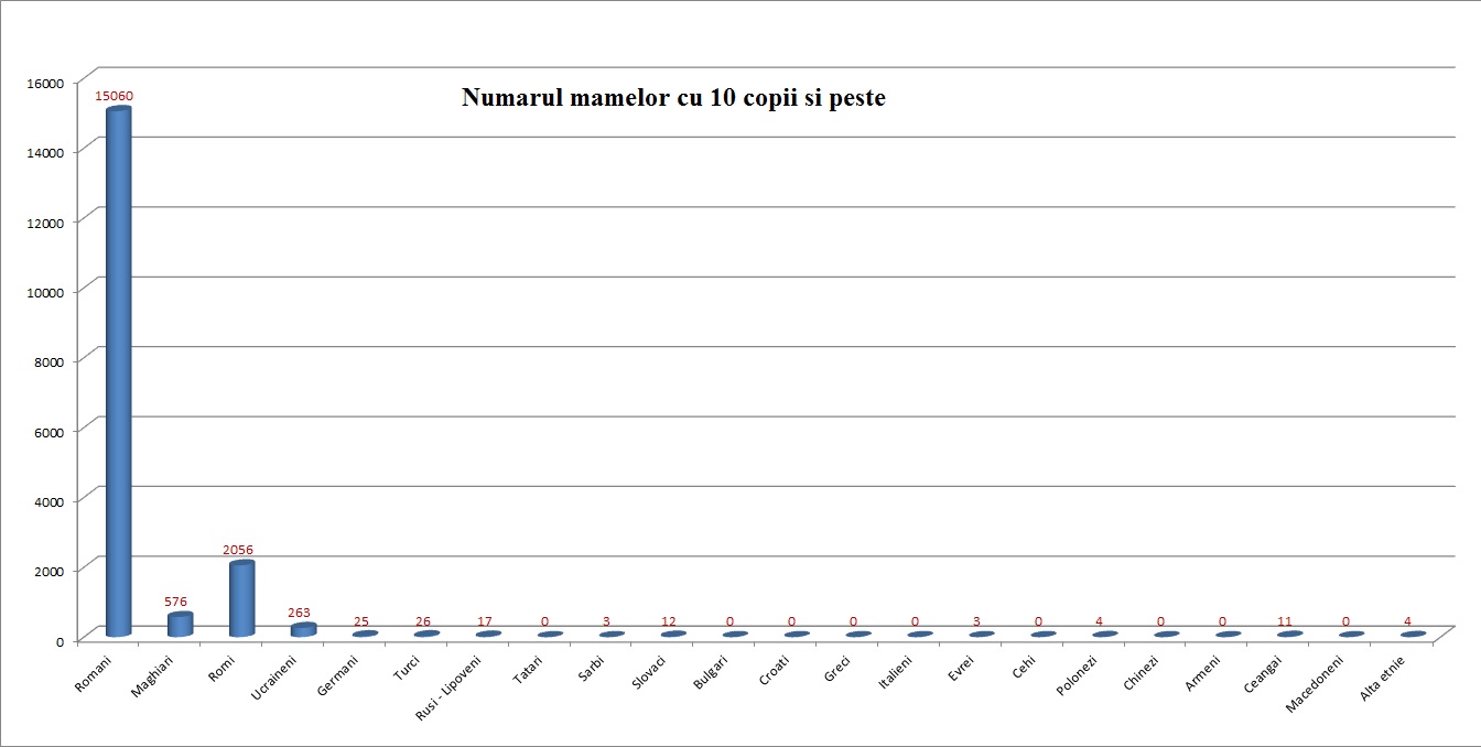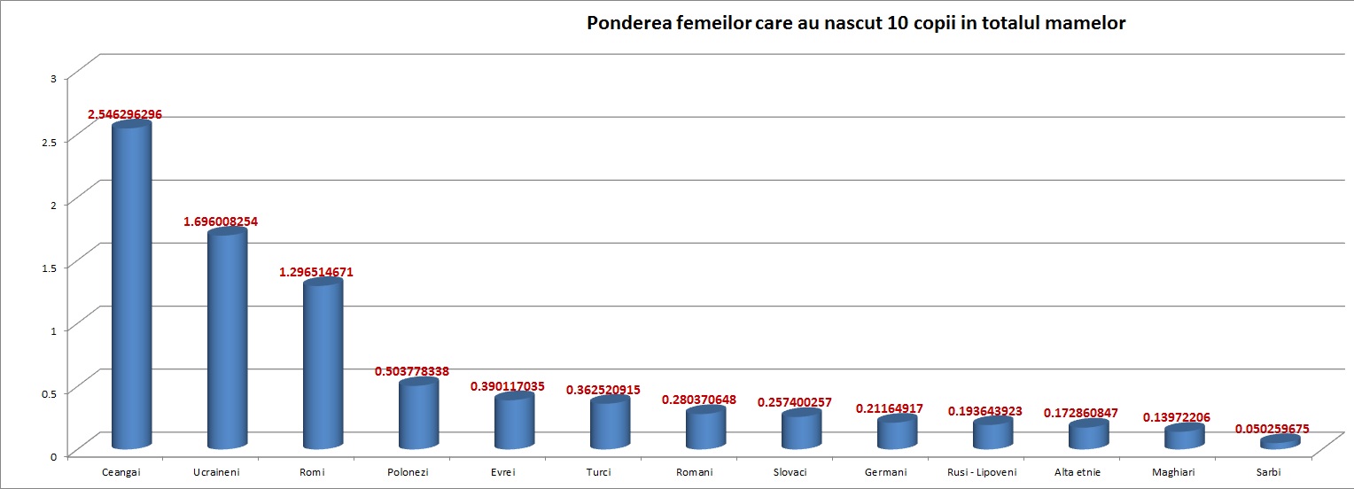 Graficul urmator arata ponderea mamelor avand cel putin 10 copii in total mame din etnia din care fac parte. Rromii sunt e locul al treilea, dupa ceangi si ucraineni.