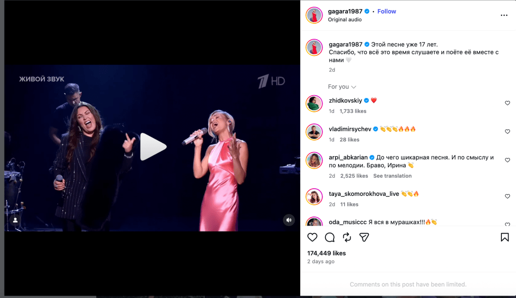 O altă cântăreață populară este Polina Gagarina, care recent a intrat în componența Consiliului prezidențial pentru cultură și a cântat inclusiv la concertele organizate direct de Kremlin, cu ocazia Zilei Rusiei și Zilei Unității Naționale. Și aceasta este, de asemenea, este foarte activă pe Instagram. Pe contul său, Polina Gagarina publică secvențe de la concertele sale, inclusiv cele transmise de „Pervîi Canal”, dar îi și felicită pe ruși de „Ziua Victoriei”, sărbătoare folosită de propaganda rusă pentru a sublinia așa-zisa superioritate militară față de Occident.