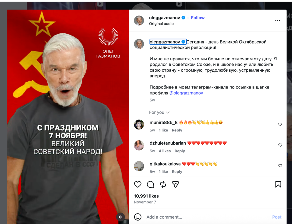 Pe Instagram, Gazmanov felicită rușii și de Ziua Constituției, și de Ziua Marii Revoluții din Octombrie.