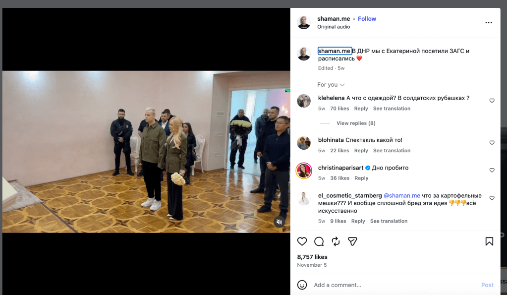 Chiar și așa, acesta nu a renunțat la utilizarea Instagram, rețea considerată extremistă de Kremlin. Tot pe această platformă, cântărețul rus a anunțat nunta sa cu Ecaterina Mizulina, cea care este președinta „Ligii pentru Internet sigur din Rusia”, organizația care “a interzis” mai multe persoane publice, inclusiv din cauza atitudinii “neconforme” față de autoritățile ruse. Este important de menționat că nunta celor doi a avut loc, în mod simbolic, în Donbas, lucrul intenționat menționat în postarea pe Instagram. Cei doi au fost îmbrăcați în haine de culoarea asemănătoarea uniformelor militare.