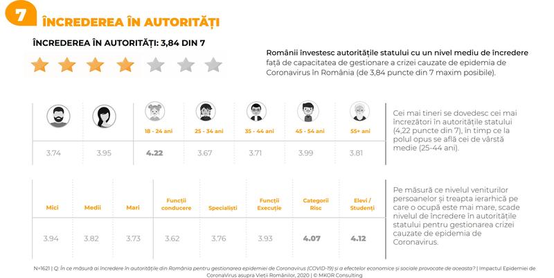 Cei mai tineri se dovedesc cei mai încrezători în autoritățile statului (4,22 puncte din 7), în timp ce la polul opus se află cei de vârstă medie (25-44 ani), respectiv 3,6-3,7 stele. Pe măsură ce nivelul veniturilor persoanelor și treapta ierarhică pe care o ocupă este mai mare, scade nivelul de încredere în autoritățile statului pentru gestionarea crizei cauzate de epidemia de Coronavirus.