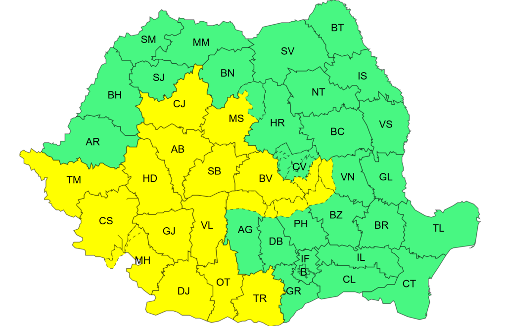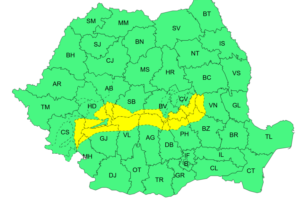 Primul cod galben de precipitații însemnate cantitativ, zăpadă la munte și intensificări de vânt și viscol în zona înaltă este valabilă între 23 februarie, ora 10:00 – 24 februarie, ora 10:00.