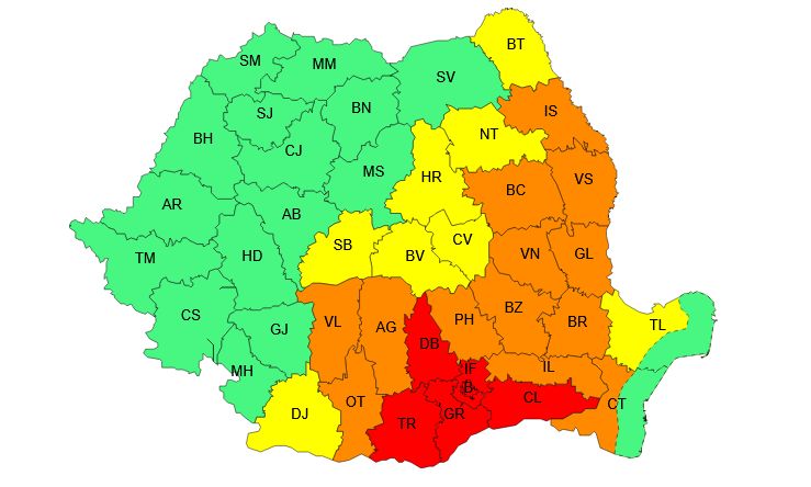 Cod roșu emis de ANM pentru duminică, 27 iulie. Valul de căldură va fi intens în județele Teleorman, Giurgiu, Dâmbovița, Călărași, Ilfov și municipiul București, unde va fi caniculă și se vor înregistra temperaturi maxime de 39…41 de grade. Disconfortul termic va fi deosebit de accentuat, iar indicele temperatură-umezeală (ITU) va depăși pragul critic de 80 de unități. Minimele termice vor fi de 20…23 de grade, caracterizând o noapte tropicală.