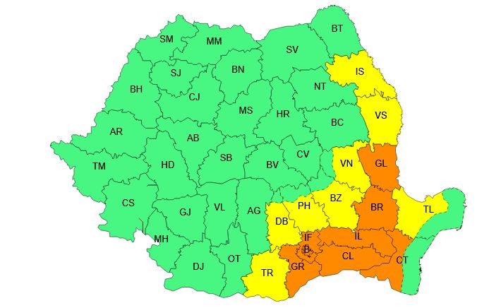 Cod portocaliu pentru duminică valabil pentru estul Olteniei, local în Muntenia, în sudul și centrul Moldovei, precum și în sudul Dobrogei continentale, unde valul de căldură se va menține intens, va fi caniculă, disconfort termic accentuat, iar indicele temperatură-umezeală (ITU) va depăși pragul critic de 80 de unități. Temperaturile maxime se vor încadra între 35 și 39 de grade. Minimele termice vor fi de 18…22 de grade și local vor caracteriza o noapte tropicală.