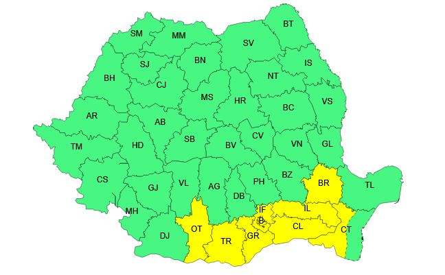 Codul galben de caniculă și disconfort termic este valabil luni, între orele 12:00 și 21:00, și va afecta judeţele Olt, Teleorman, Giurgiu, Ilfov, Călăraşi, Ialomiţa, Brăila, Galaţi, în municipiul Bucureşti şi parţial în judeţele Vrancea, Buzău, Prahova, Dâmboviţa, Argeş şi Constanţa, potrivit News.ro.