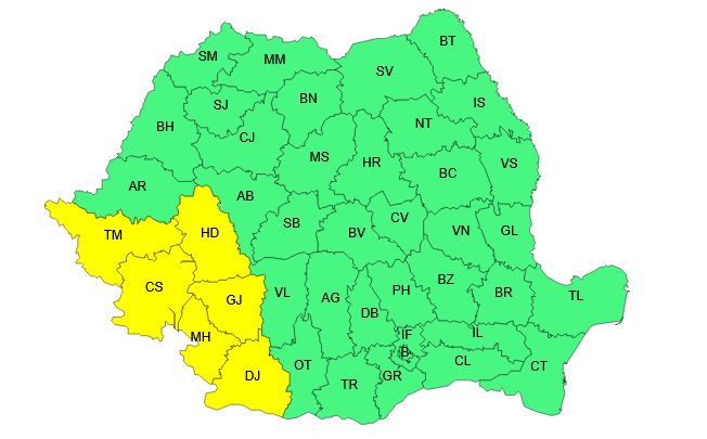 Marți, între orele 01:00 și 10:00, intră în vigoare o atenționare meteo de ploi, în județele Timiş, Caraş-Severin, Mehedinţi, Dolj, Gorj şi Hunedoara, mai transmite ANM.