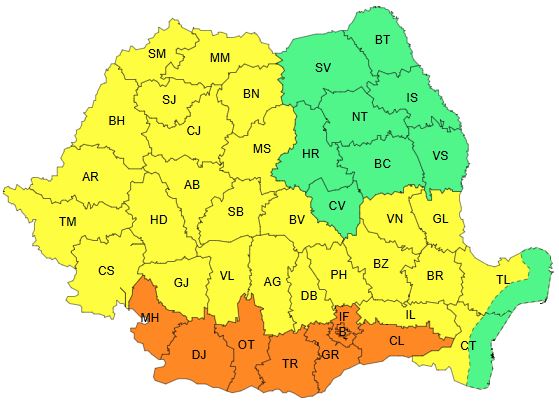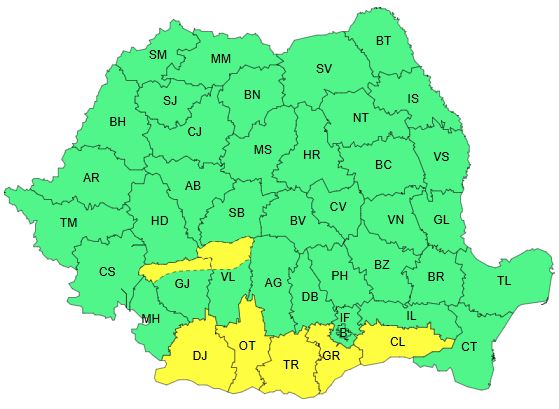 Valul de căldură va persista în nordul Olteniei, în nordul și estul Munteniei și în partea continentală a Dobrogei. Va fi caniculă și disconfort termic ridicat, iar indicele temperatură-umezeală (ITU) va depăși ușor pragul critic de 80 de unități. Temperaturile maxime vor fi cuprinse între 33 și 37 de grade, iar cele minime între 18 și 21 de grade.
