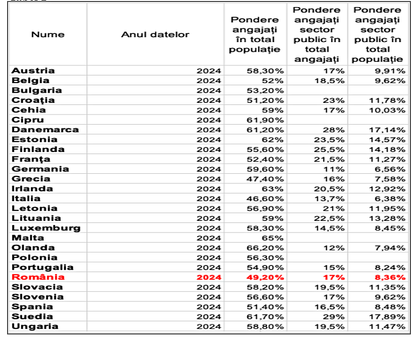 Datele arată că țara noastră are a șasea cea mai mică pondere a angajaților din sectorul public în populația totală. Procente mai mici decât în România pot fi găsite doar în Portugalia, Olanda, Italia, Germania și Grecia.