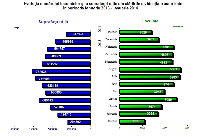In luna ianuarie 2014, s-au eliberat 1.573 autorizatii de construire pentru cladiri rezidentiale, in scadere cu 7,1% fata de luna ianuarie 2013. Din cele 1573 de autorizatii, 65% sunt pentru zona rurala, a transmis vineri Statistica. In unele zone s-au inregistrat scaderi ale autorizatiilor acordate, in vreme ce altele au cunoscut cresteri. Cele mai semnificative scaderi s-au inregistrat in regiunile: Sud-Muntenia (-83 autorizatii), Nord-Est (-42 autorizatii) si Centru (-32 autorizatii). Cresteri ale numarului de autorizatii eliberate pentru construirea de cladiri rezidentiale au fost in trei regiuni de dezvoltare: Bucuresti-Ilfov (+37 autorizatii), Vest (+8 autorizatii) si Nord-Vest (+7 autorizatii).