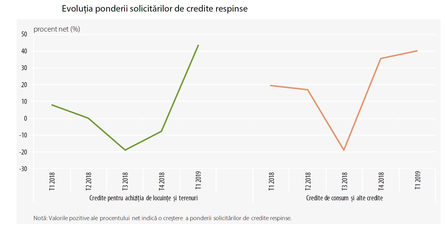 Primul trimestru al anului 2019 a fost marcat de o înăsprire semnificativă a standardelor de creditare pe ambele segmente principale de împrumuturi acordate populației. Pentru trimestrul următor (T2 2019), instituțiile de credit anticipează o înăsprire marginală a standardelor de creditare în cazul împrumuturilor ipotecare și moderată la nivelul creditelor de consum destinate sectorului populației.