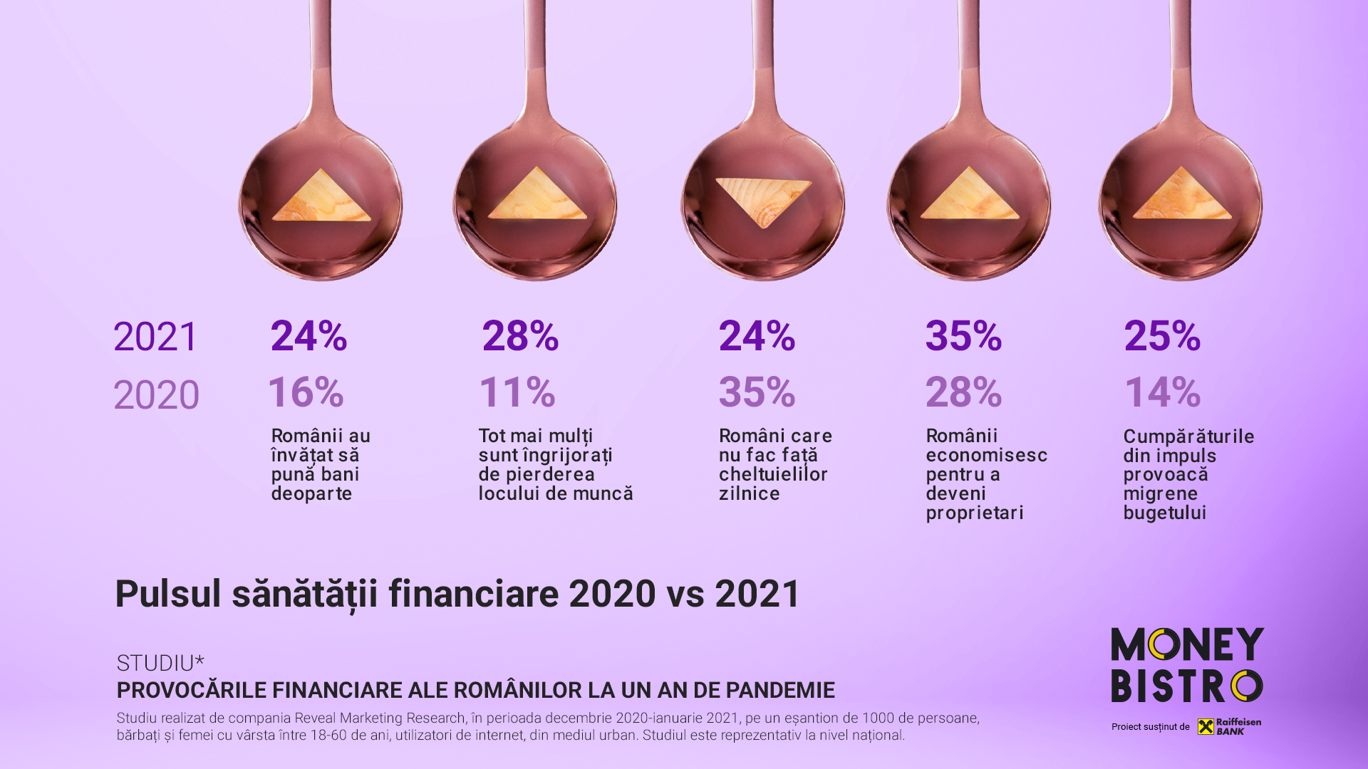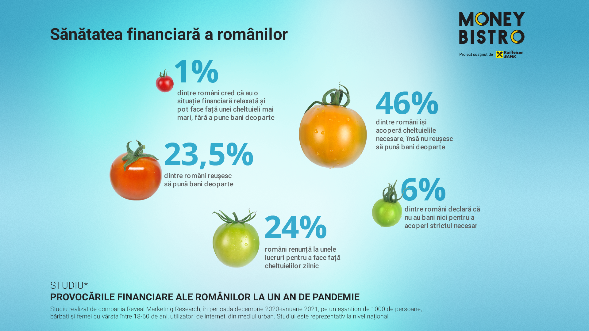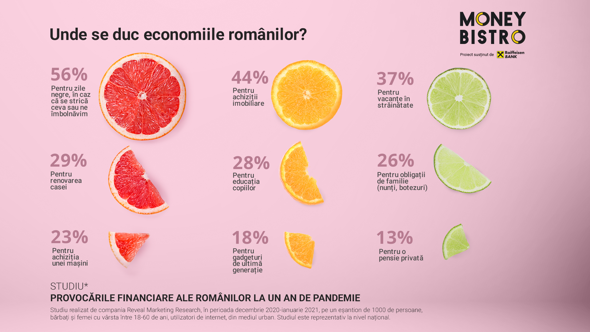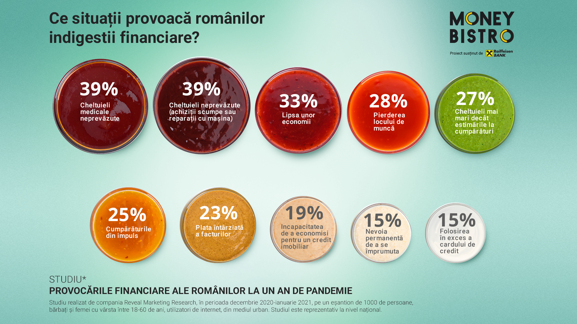 Studiul despre provocările și obiceiurile financiare ale familiilor din România a fost realizat de compania Reveal Marketing Research la solicitarea Raiffeisen Bank, în al doilea an consecutiv, în perioada decembrie 2020-ianuarie 2021, și conține un element calitativ (interviuri în profunzime, cu persoane din mai multe segmente de vârstă), cât și unul cantitativ (sondaj în rândul românilor din mediul urban care utilizează internetul). Sondajul a fost aplicat pe un eșantion de 1000 de persoane, bărbați și femei cu vârsta între 18-60 de ani, utilizatori de internet, din mediul urban. Studiul este reprezentativ la nivel național.
