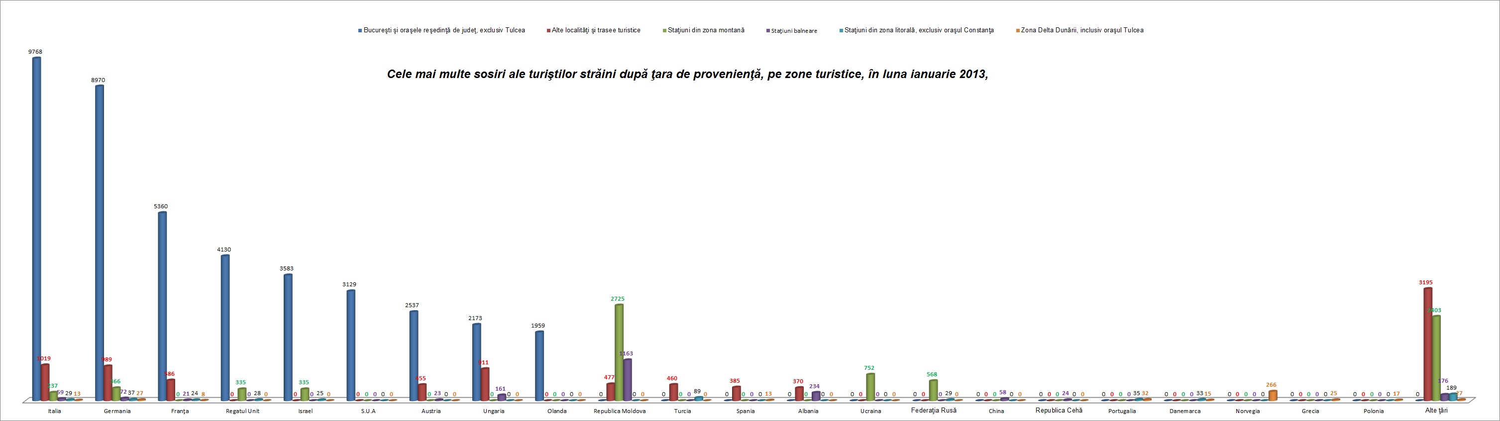 Sosirile vizitatorilor straini in Romania, inregistrate la punctele de frontiera, au fost in luna ianuarie 2013 de 461,5 mii, in scadere cu 4,1 % fata de luna ianuarie 2012. Majoritatea vizitatorilor straini provine din tari situate in Europa ( 95,7%). Din statele Uniunii Europene s-au inregistrat 61,8% din totalul sosirilor vizitatorilor straini in Romania. Dintre statele Uniunii Europene cele mai multe sosiri s-au inregistrat din Ungaria (33,7%), Bulgaria (24,4%), Germania (8,1%), Italia (7,9%), Polonia (4,9%) si Austria (4,5%).