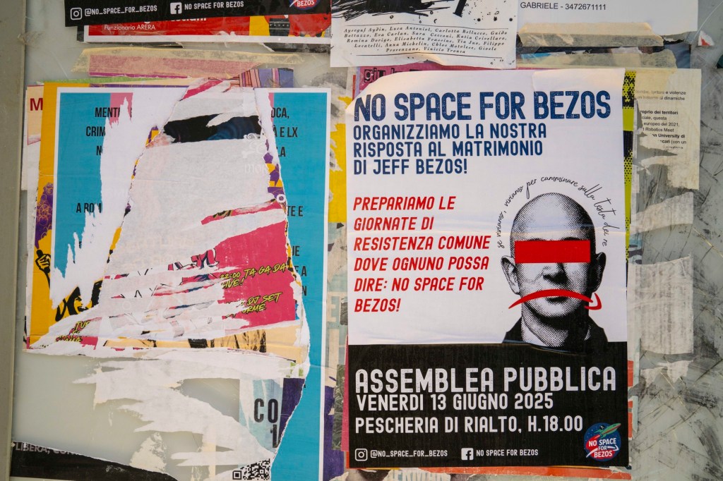 Un afiș cu mesajul „Niciun loc pentru Bezos”, în semn de protest față de punerea la dispoziției a orașului Veneția pentru nuntă Foto: M. Scott Brauer/ZUMA / SplashNews.com / Splash / Profimedia