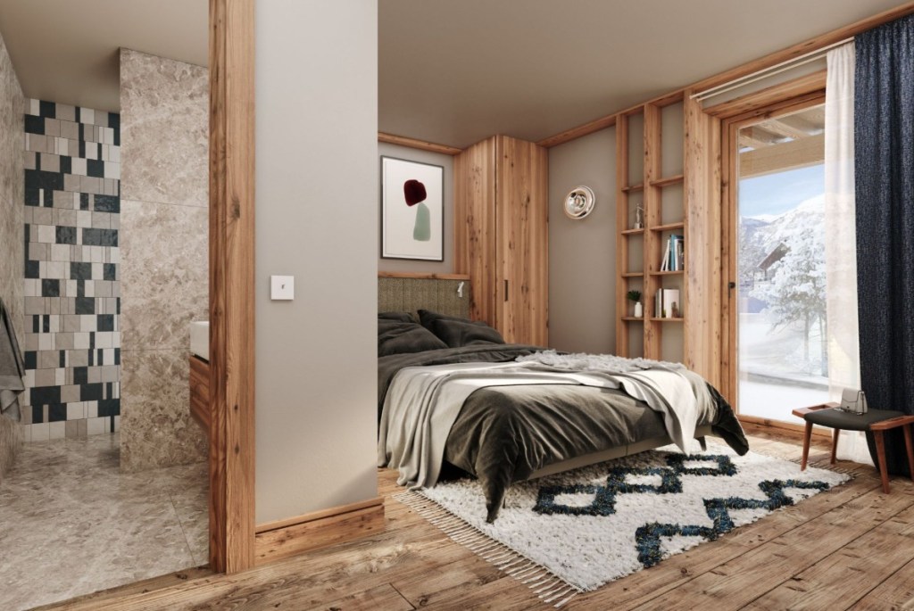 E o cabană tot din lemn, de 6 camere și 156 mp, ajunge la un preț de 3,400,000 €. Cabana face parte dintr-un ansamblu de alte 3 cabane, la 350 m de o pârtie de ski.