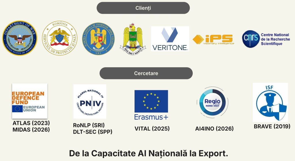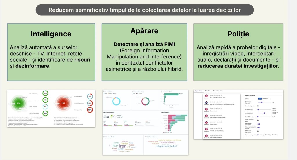 „De exemplu, cu Academia Națională de Informație, avem implementat o soluție care monitorizează dezinformarea online, pe site-uri web. Cu SPP, din nou, avem o gamă mai largă de soluții și pe text, dar avem și un proiect de cercetare comun, administrat de UEFISCDI, care este pe procesare multimodală, și video, și text”.
