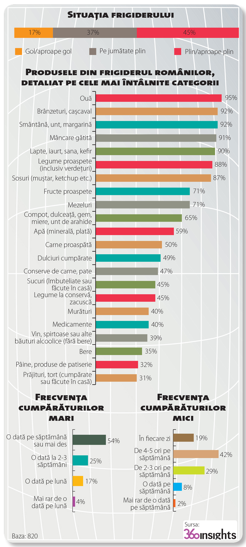 Circa 45% din romanii din mediul urban isi pastreaza frigiderul foarte bine aprovizionat, fiind aproape plin sau plin de produse, se arata intr-un studiu realizat de agentia de cercetare de piata 360insights pentru revista Magazinul Progresiv. Aceast este caracteristic celor aflati la apogeul profesional (35-44 ani), avand studii superioare si venituri ridicate. La cealalta extrema, 17% dintre gospodarii au frigiderul mai degraba gol, iar din aceasta categorie fac parte in special persoanele in varsta (55-64 ani), cat si cele cu un nivel social scazut ca educatie si venituri. „Daca in anumite cazuri frigiderul gol poate fi o intamplare (sa zicem ca momentul intervievarii este chiar inainte de aprovizionare), profilul acestora ne duce totusi cu gandul la un segment ce nu are posibilitatea financiara de a-si umple frigiderul cu produse, rezumandu-se mai degraba la strictul necesar”, explica Nadia Alexa, Quantitative Researcher in cadrul 360insights.