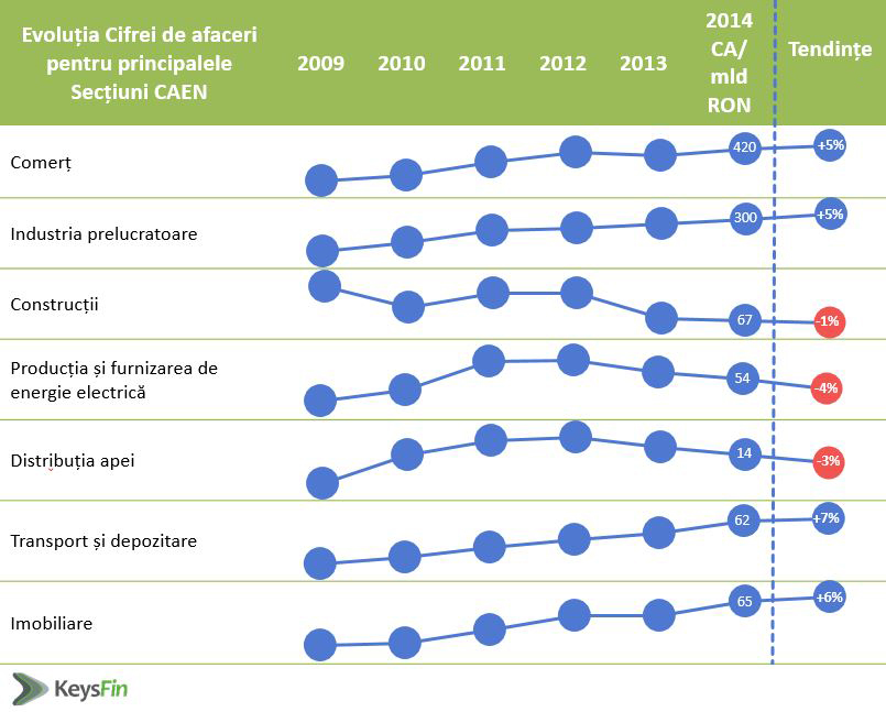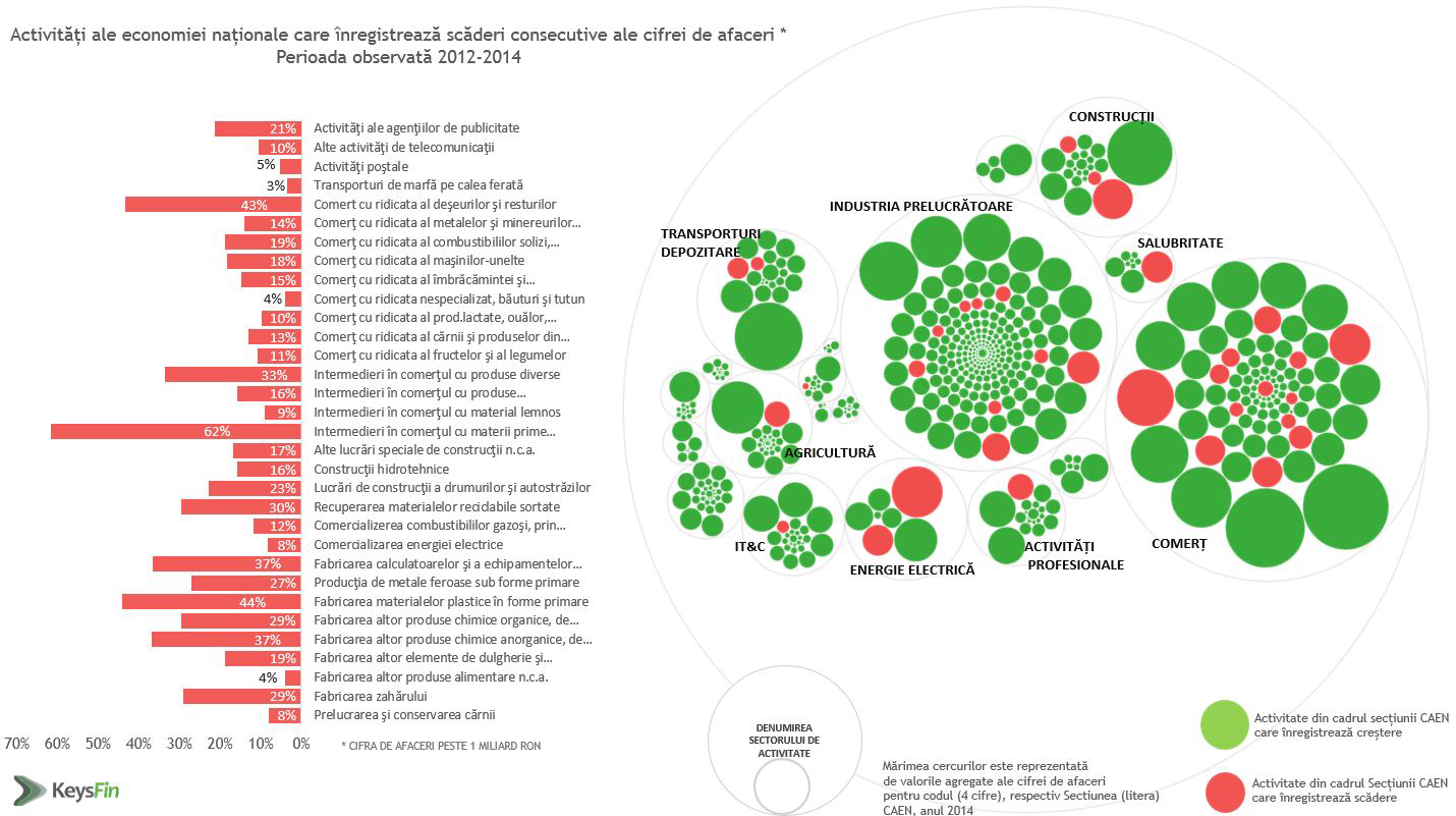 Analistii KeysFin au luat in calcul cifrele de afaceri de peste 1 mld. lei inregistrate in intervalul 2012-2014 si au descoperit, astfel, numai putin de 32 de ramuri economice unde evolutia a devenit negativa in 2014.