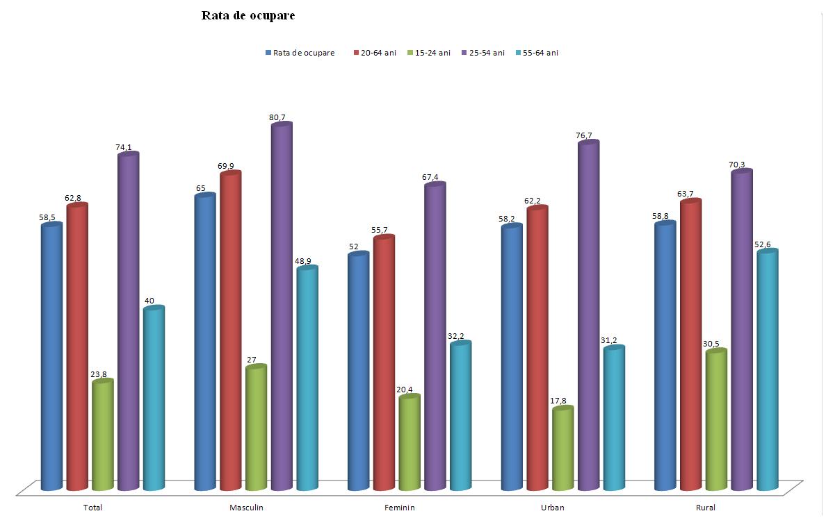Rata de ocupare a populatiei in varsta de munca (15-64 ani) de 58,5% s-a redus fata de anul anterior cu 0,3 puncte procentuale. Acest indicator avea, ca si in anii anteriori, valori mai ridicate pentru barbati (65,0%, fata de 52,0% pentru femei) si pentru persoanele din mediul rural (58,8%, fata de 58,2% in mediul urban). Rata de ocupare a tinerilor (15-24 ani) era de 23,8%. Rata de ocupare a persoanelor varstnice (55-64 ani) a fost de 40,0%.