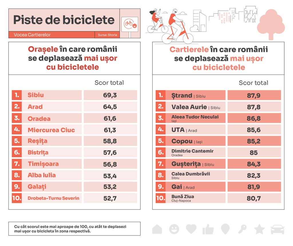 Pe primele cinci locuri în topul cartierelor în care locuitorii se deplasează mai ușor cu bicicletele datorită existenței multor piste se află cartierul Ștrand din Sibiu (scor 87,9), Valea Aurie din Sibiu (87,8), Aleea Tudor Neculai din Iași (86,8), UTA din Arad (85,6) și Copou din Iași (85,2).