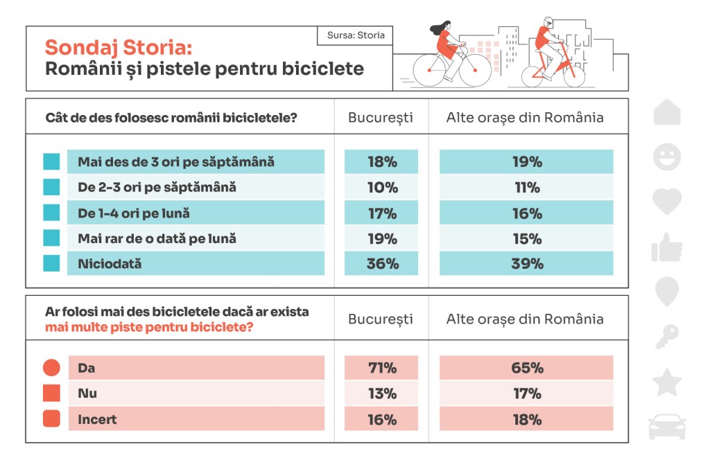 Conform celui mai recent sondaj realizat de Storia, 36% dintre respondenții din București și 39% dintre respondenții din alte orașe ale țării nu folosesc niciodată bicicletele pentru a se deplasa, în timp ce 19% dintre bucureșteni și 15% dintre locuitorii din alte orașe folosesc bicicletele mai rar de o dată pe lună. În același timp, 17% dintre respondenții din București și 16% dintre cei din țară merg cu bicicletele de 1-4 ori pe lună.