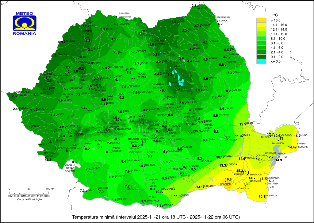 Vineri au fost +22,4 ºC la Călărași, iar sâmbătă dimineață minima a fost extraordinar de ridicată pentru ultima decadă din noiembrie (+16,8 C, demnă de o dimineață de vară), arată hărțile ANM.