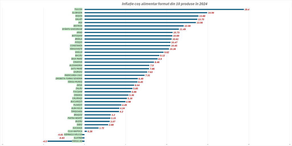 La polul opus, există orașe în care prețurile medii ale celor 10 alimente au scăzut anul trecut: Târgu Jiu, Slatina și Râmnicu Vâlcea.