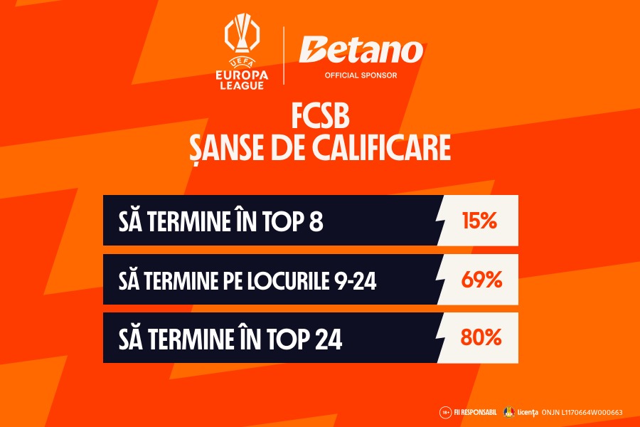 Primele opt clasate la finalul fazei principale se califică în optimile de finală, iar în acest moment FCSB are 15% șanse să se numere printre echipele calificate.