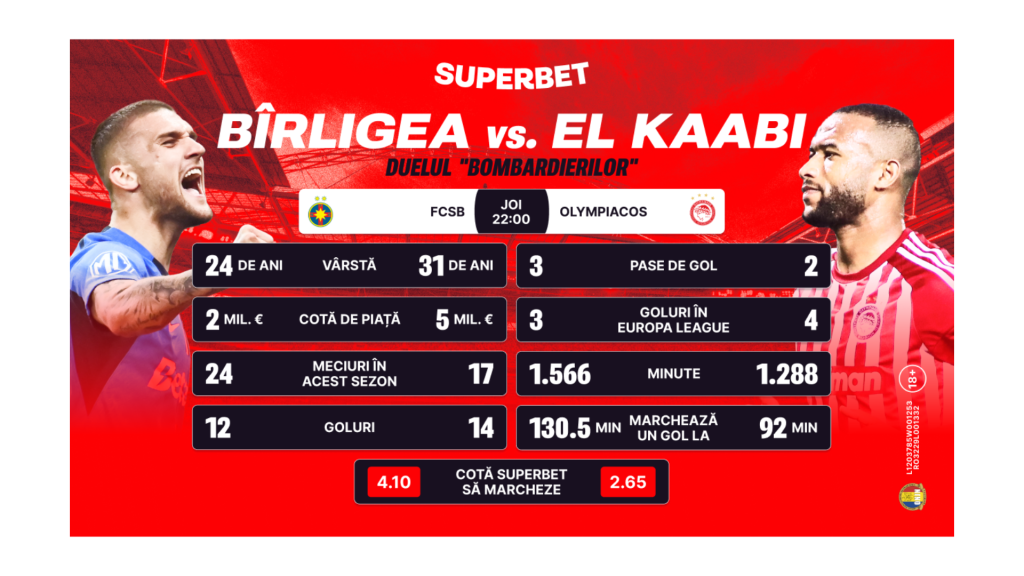 Vorbind despre lupta pentru titlul de golgheter, ea îl conține pe marocanul Ayoub El Kaabi, vârful lui Olympiacos care are deja patru goluri în primele patru meciuri. Africanul care a uimit întreaga lume a fotbalului european prin cele 16 goluri înscrise în sezonul european trecut, 11 dintre ele venind în fazele eliminatorii ale Conference League și stabilind un record în acest sens, vine la București după un hat-trick de senzație în fața lui AEK Atena în campionatul Greciei și are în spate statistici impresionante. El Kaabi are 14 goluri în 17 meciuri jucate în acest sezon, înscrie un gol la fiecare 92 de minute și doar vârsta, 31 de ani, îl împiedică să facă pasul spre o SuperPutere a fotbalului european. Va reuși să-l învingă și pe Târnovanu? Cota Superbet pentru un gol al golgheterului marocan este de 2.65!