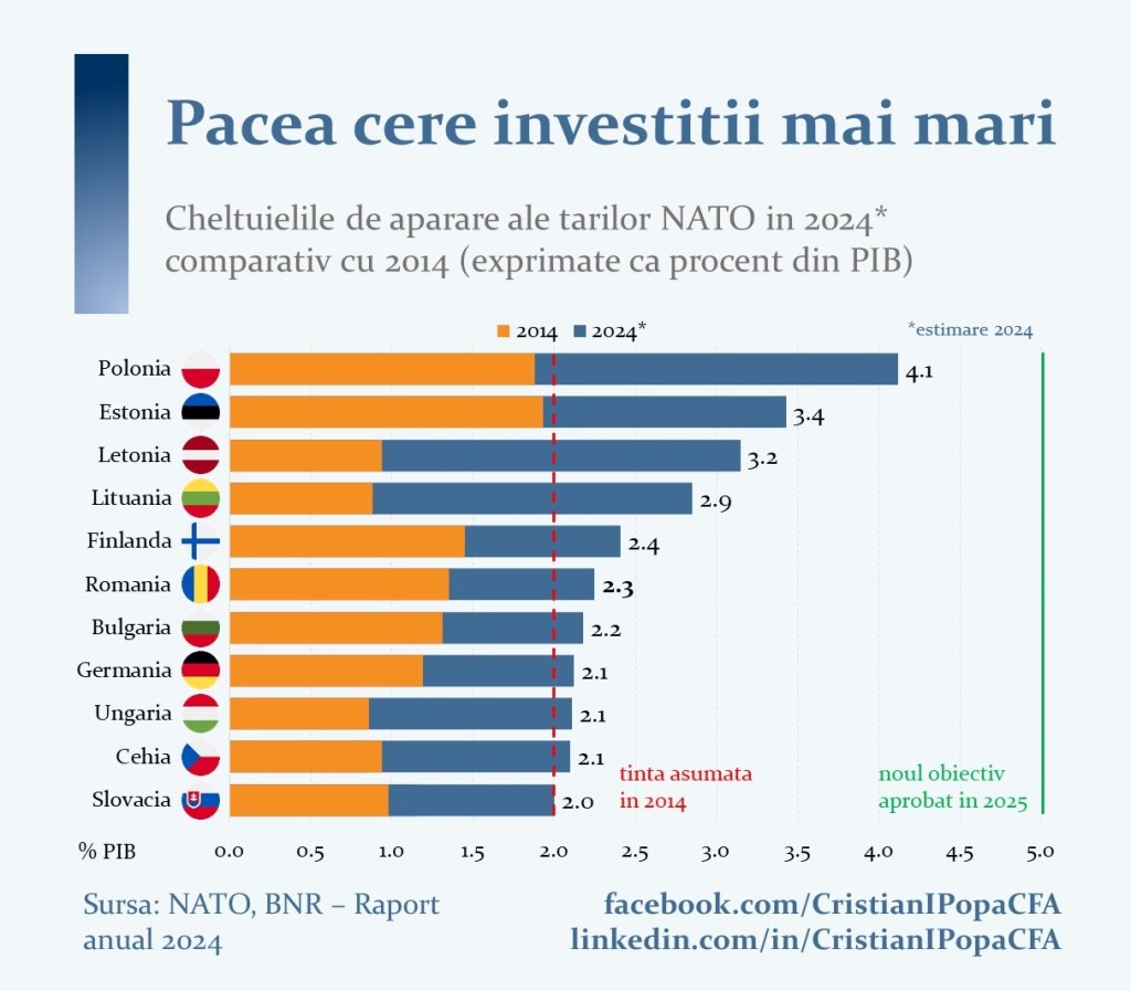 Desigur, atingerea acestor ținte presupune un efort bugetar considerabil, mai ales pentru țări cu spațiu fiscal limitat, precum România. Nu va fi ușor. În acest context, cu atât mai important este efortul de eficientizare a aparatului public și a companiilor de stat, de reducere a risipei și a cheltuielilor non-militare și de reașezare a cheltuielilor publice pe baze sustenabile. Este un efort imperios necesar și are un sprijin public amplu, cu excepția celor ce beneficiază de pe urma acestor cheltuieli, desigur, consideră Popa.