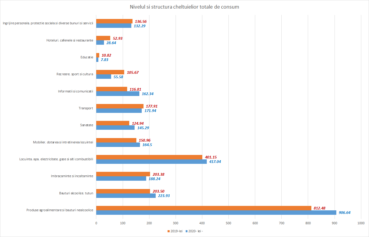 - Produsele alimentare şi băuturile nealcoolice au deţinut din consumul gospodăriilor, în medie, 34,6.