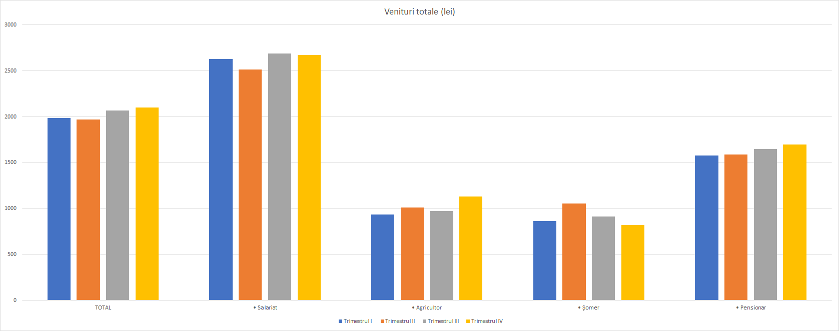 Veniturile totale medii lunare au reprezentat în trimestrul al patrulea din 2019, în termeni nominali, 4.999 lei pe gospodărie şi 1.939 lei pe persoană, iar cheltuielile totale ale populaţiei au fost, în trimestrul al patrulea din 2019, în medie, de 4.300 lei lunar pe gospodărie (1.667 lei pe persoană) şi au reprezentat 86% din nivelul veniturilor totale, potrivit INS.