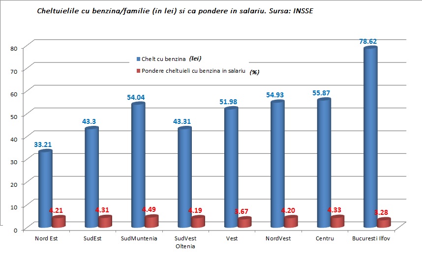 3. Desi au salariile printre cele mai mici, muntenii isi aloca cea mai mare pondere din salariu ca sa isi ia benzina-4,5%. Bucurestenii cheltuie cam 3.2% din salarii pe benzina