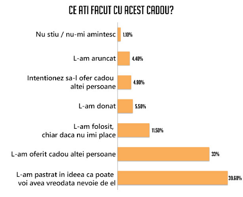Peste o treime din romani (36.4%) au declarat ca au primit în ultimul an cadouri pentru care nu aveau utilitate sau nu și le-au dorit, conform unui sondaj CATI derulat în luna noiembrie 2012 de catre Mednet Marketing Research Center pentru Edenred. Sondajul a fost realizat cu scopul de a releva atitudinea romanilor fata de cadouri, atat din perspectiva incidentei cazurilor in care persoanele intervievate au primit lucruri inutile sau nedorite, cat si din perspectiva felului in care au decis sa actioneze sau sa foloseasca ulterior respectivul cadou.