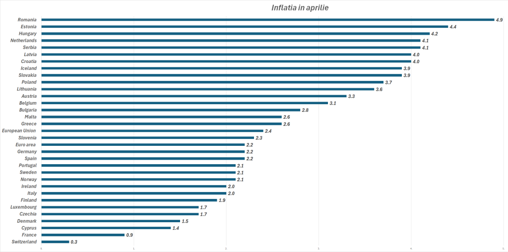 Inflația anuală în Uniunea Europeană a fost de 2,4% în aprilie 2025, în scădere față de 2,5% în martie. Cele mai ridicate rate anuale au fost înregistrate în România (4,9%), Estonia (4,4%) și Ungaria (4,2%), potrivit datelor publicate de Eurostat, oficiul de statistică al Uniunii Europene.