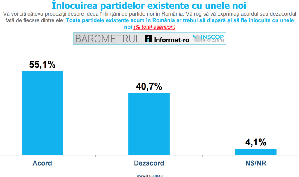 Un procent de 55% dintre români sunt de acord cu afirmația că toate partidele din țară trebuie să dispară și să fie înlocuite, potrivit unui sondaj INSCOP care a arătat și că jumătate dintre respondenți au spus că ar vota un partid nou.