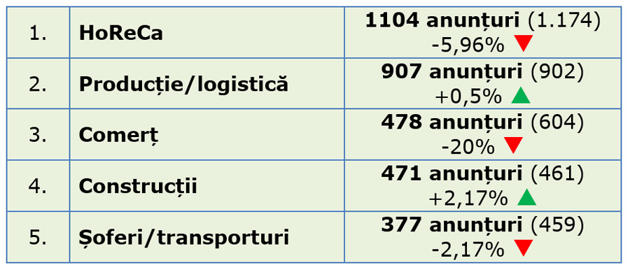 - Cele mai multe anunțuri de locuri de muncă au fost în HoReCa, producție și comerț;