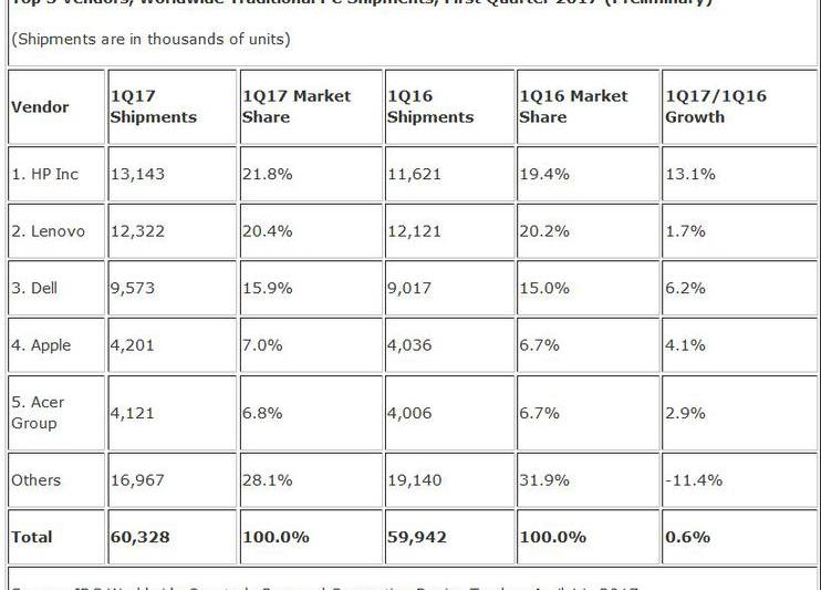Intre ianuarie si martie livrarile de PC-uri pe plan mondial au crescut de la 59,9 milioane unitati, la 60,3 milioane unitati, iar HP are 21,8% din piata si Lenovo are 20,4%. Dell s-a propiat de 16%, Apple a ramas la 7%, iar Acer a avut 6,8%.